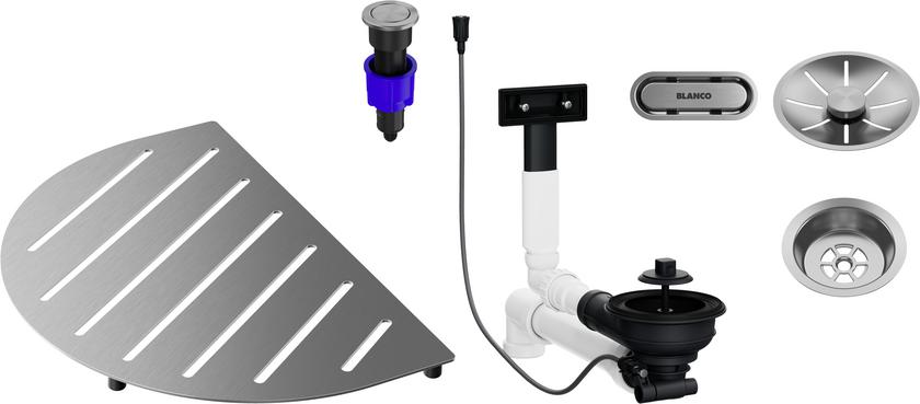 BLANCO 527993 Príslušenstvo k drezom Oovalon Components – nerez kartáčovaná, odtoková armatúra vrátane odkvapkávacej dosky, InFino ventil s PushControl III.