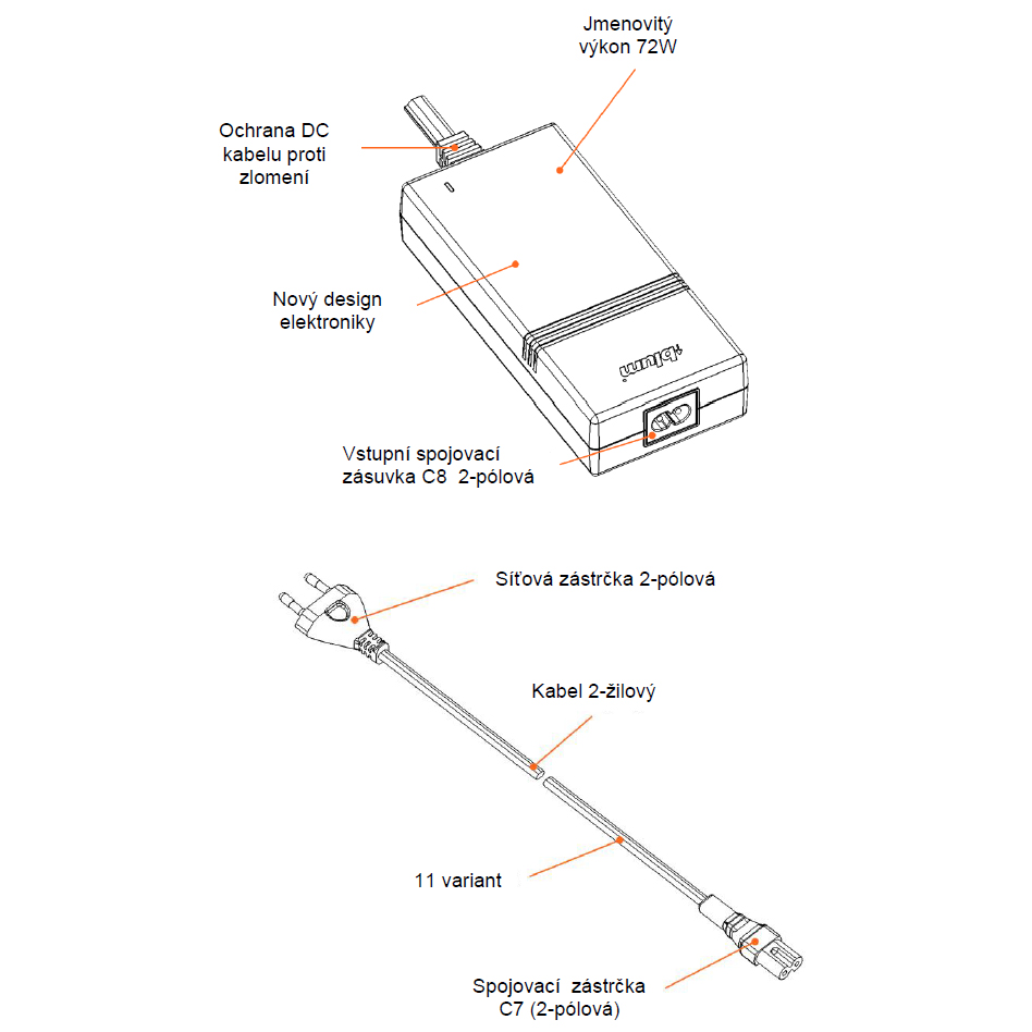 Optimalizovaný napájací zdroj (trafo) Servo-drive so zvýšeným výkonom a zníženým elektromagnetickým vyžarováním (CE/UL) . Nová generácia napájacích zdrojov je dodáváná spolu s oddeliteľným napájacím káblom Z10M200E. Napájací vstup na zdroji je dvojpinová zásuvka C8 (100-240VAC / 50-60Hz), výstup je špeciálnym profilovým káblom Servo-drive o dĺžke 2m s ochranou proti zalomeniu (24VDC). Napájací dvojžilový kábel 230V o dĺžke 2m je osadený dvojkolíkovou vidlicou EUR 7/16 (C) a dvojpinovou zástrčkou C7, taktiež s ochranou proti zalomeniu.