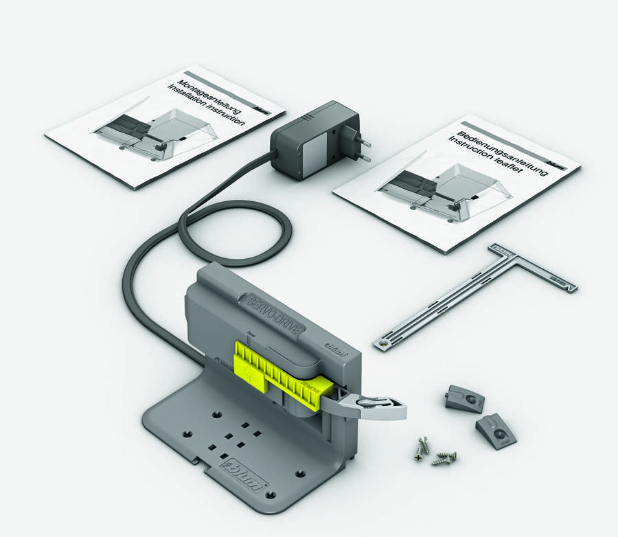Kompletná sada pre 1 zásuvku. Využitie najmä pre zásuvku s odpadkovým košom. Sada obsahuje: Nový držiak servojednotky, pohonná jedotka, transportný kryt (= dištančný držiak), ochrana pred kvapkajúcou vodou, konektor pre napojenie sieťového adaptéra, adaptér a kábel 110cm, montážna pomôcka, distančné dorazy, vruty, návod na montáž, návod na obsluhu . POZOR: Na túto sadu (trafo) už nejde napojiť ďalšie jednotky!