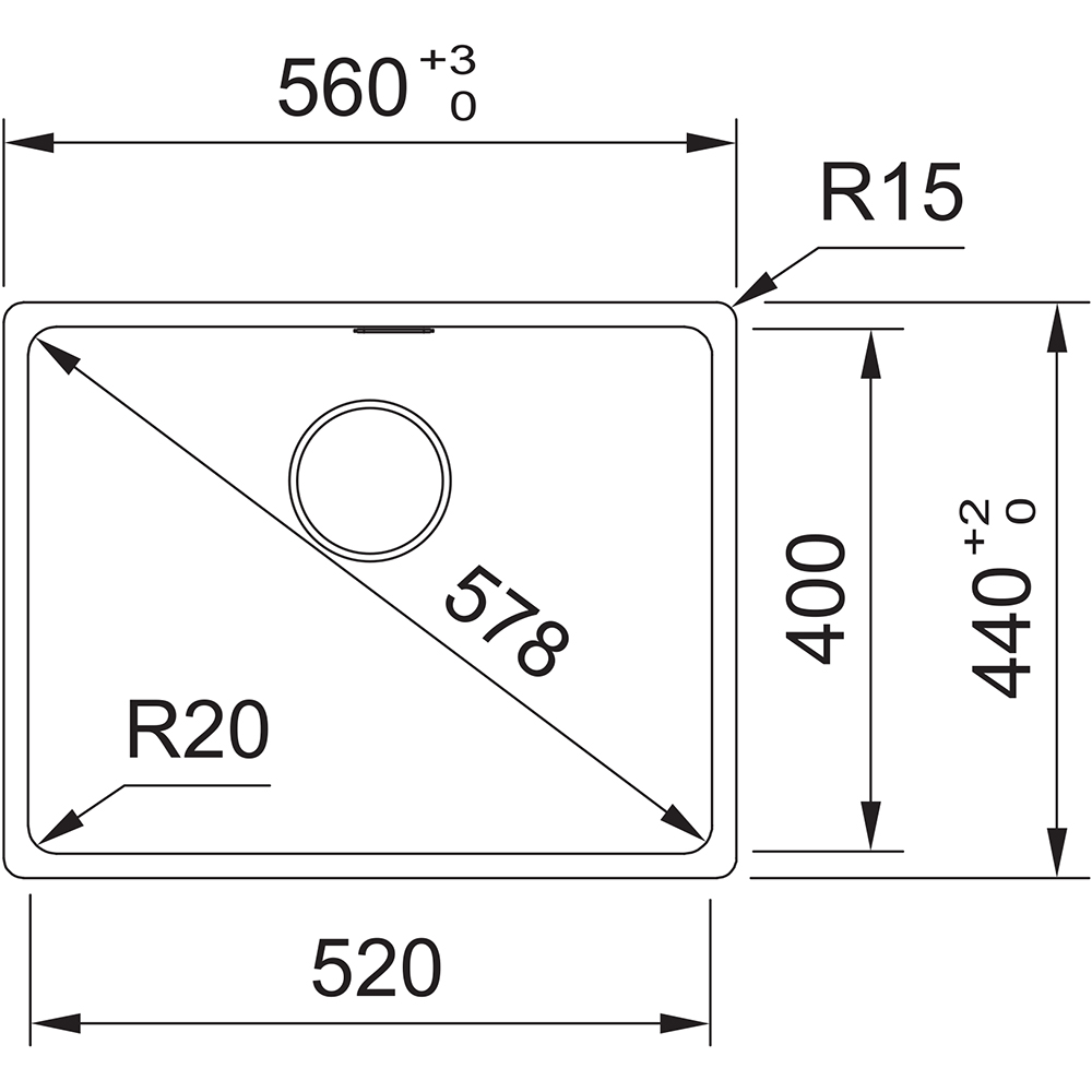 Výrez: 520 × 400 mm (Rádius 20 mm)