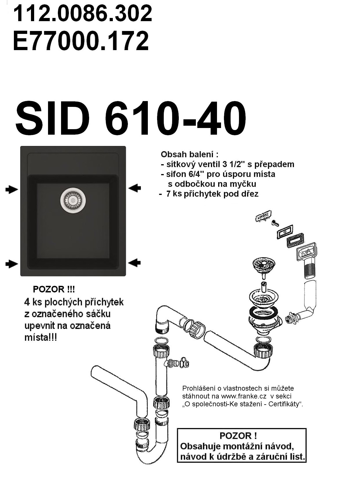 Franke Sirius SID 610-40 Tectonite biela Spodná skrinka od 450mm Rozmery: 430×530mm Výrez: 410×510mm Drez: 365×378×200mm Cena zahŕňa: - sítkový ventil 3 1/2“ s prepadom - sifón na úsporu miesta 6/4“ s odbočkou na umývačku riadu - otvor pre batériu priemer 35mm Možnosť vyvŕtať ďalší otvor pre dávkovač saponátu alebo otočný gombík sitkového ventilu vykružovacím vrtákom priamo pri montáži. Skrytý prepad 114.0503.010