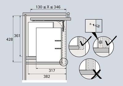 kovanie pre vložené výklopné dvierka. šírka dverí max.1200 mm. Max.hmotnosť dvierok 8 kg. Výška dverí od 145 do 400 mm. nastavenie výšky +- 1 25 mm. Šedý plast.