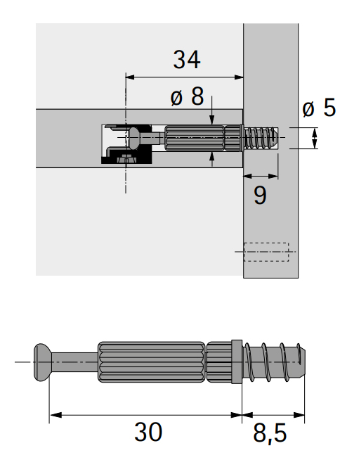 Kolík k zaskrutkovaniu Twistr/púzdra pre Rastex 15, eurozávit pre priemer vŕtania 5 mm, upínací rozmer 30 mm, oceľ pozinkovaná, plast čierny.