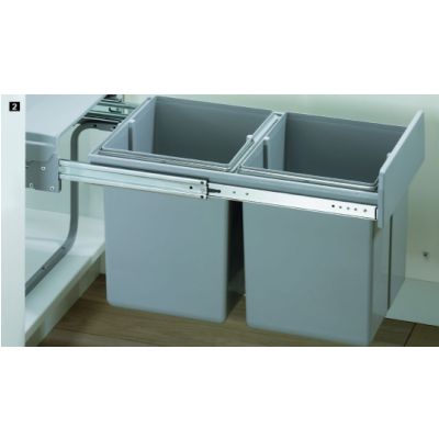 Pre šírku skrinky min.400 mm. Montáž na dno korpusu. Systém s plnovýsuvom. Šírka 338 mm, hĺbka 485 mm, výška 385 mm. Sada obsahuje: 2 nádoby 20L, kompletné kovanie s plnovýsuvom a vekom korpusu. Nádoba+veko: plast šedý.