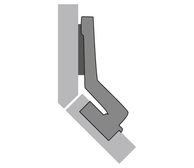 Klipový miskový záves vložený pre rohové a uhlové skrine s korpusovým uhlom 45°, uhol otvárania 95°, Hrubka dverí od 16 mm, priemer misky 35 mm, s pružinou. Doporučené podložky: D3 skrutka 118057; D3 euro 154410.