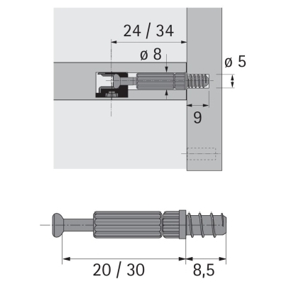 Kolík k naskrutkovaniu Eurozávit pre priemer vŕtania 5 mm. Upínací rozmer 30 mm. Oceľ pozinkovaná, plast čierny.