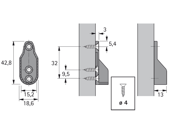 K naskrutkovaniu s 3 otvormi na skrutky, rozteč otvorov 32 mm, oceľ - povrchová úprava do farby hliníku.