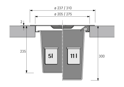 Odpadkový kôš k zabudovaniu, výška 235 mm.