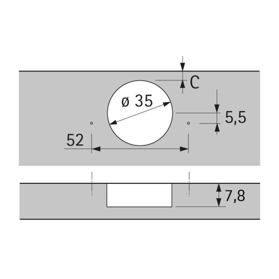 Záves vložený bez doťahovej pružiny pre dvere o hrúbke 10-16 mm. Hĺbka misky 7,8mm. Pre korpus DTDL18 podložka D=1,5 na vrut 106403; D=1,5 na euro 119240. Krytka misky č.105408 sa objednáva samostatne.