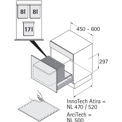 K postaveniu do vysokej zásuvky Innotech dĺžky 470 alebo 520mm, pre šírku skrine 450-600 mm. Objem 33 litrov. Vstavaná výška 297 mm. Sada obsahuje: 3 ks nádoby s víkom 17+ 8 + 8 litrov, 1 ks vložená rohož. Zásuvka ImnnoTech sa objednáva samostatne.
