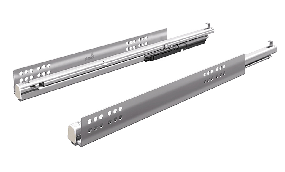 Plnovýsuv Quadro V6 Silent System pre systém InnoTech - ľavý - Nosnosť 30 kg. Montáž nasunutím - zásuvka sa položí na výsuvy a zasunie sa do korpusu. Silent Systém - tlmič integrovaný do výsuvu zajistí Mäkké a tiché zatváranie zásuvky.