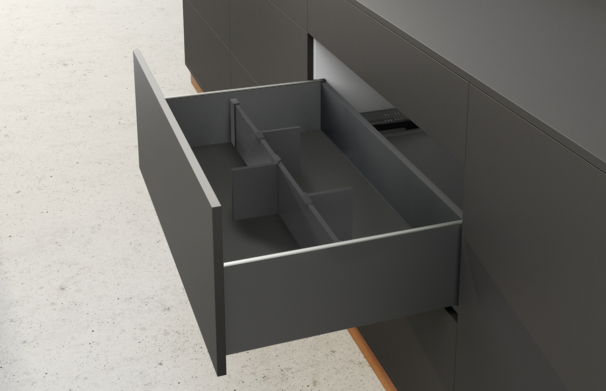 OrgaStore 830 sada, 600, antracitová. Číslo materiálu 9230256. Systém profilov s pozdĺžnymi deliacimi prvkami pre vysoké zásuvky a vnútorné vysoké zásuvky. Je možné použiť v zásuvkách AvanTech YOU menovitej dĺžky od 300 mm. Sady sú určené pre štandardné šírky korpusu a hrúbku boku korpusu 16 – 19 mm. Odporúčame použiť protišmykovú podložku. set obsahuje: 1 ks hliníkový profil s plastovými adaptérmi Plastové deliace prvky, množstvo viď obrázok