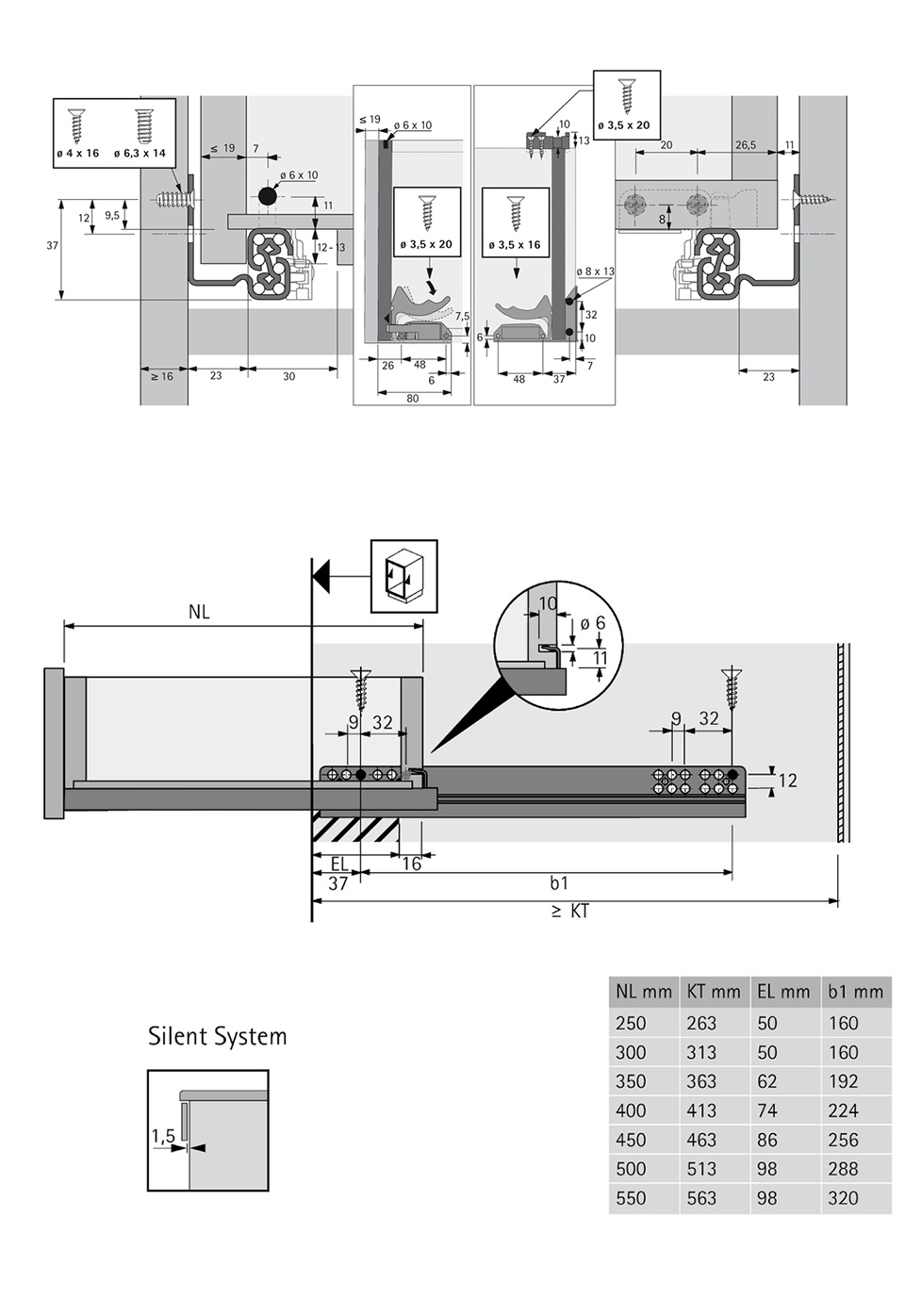 Čiastočný výsuv Quadro 25 s integrovaným tlmením Silent System pre hrúbky bočníc zásuvky do 19mm. Inštalácia zasunutím pomocou spojok a nastavenie výšky bez použitia náradia. Nosnosť 25kg; vstavaná šírka EB23; minimálna hĺbka skrinky 563mm.