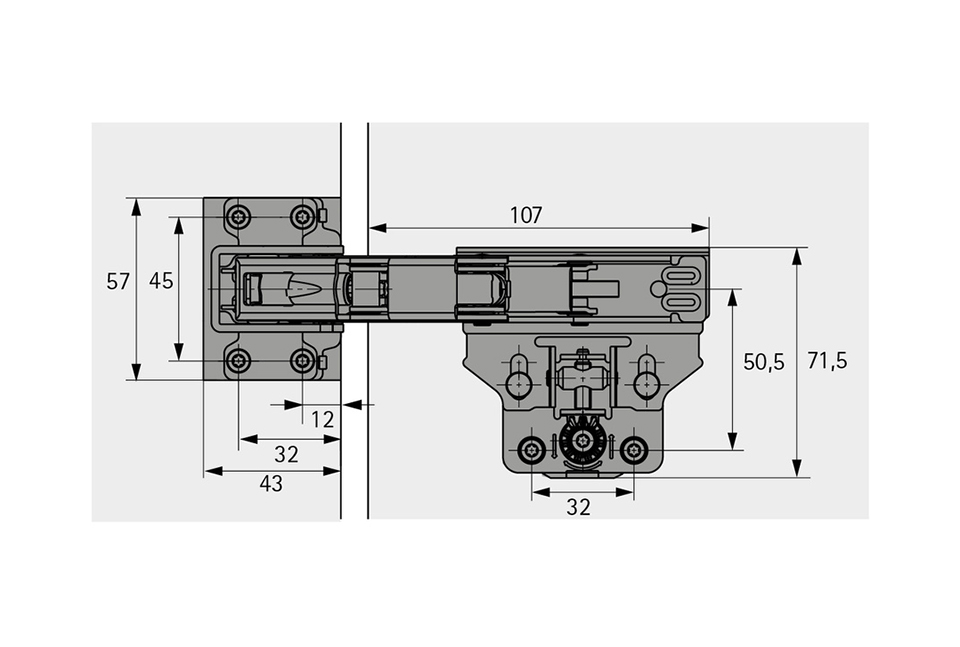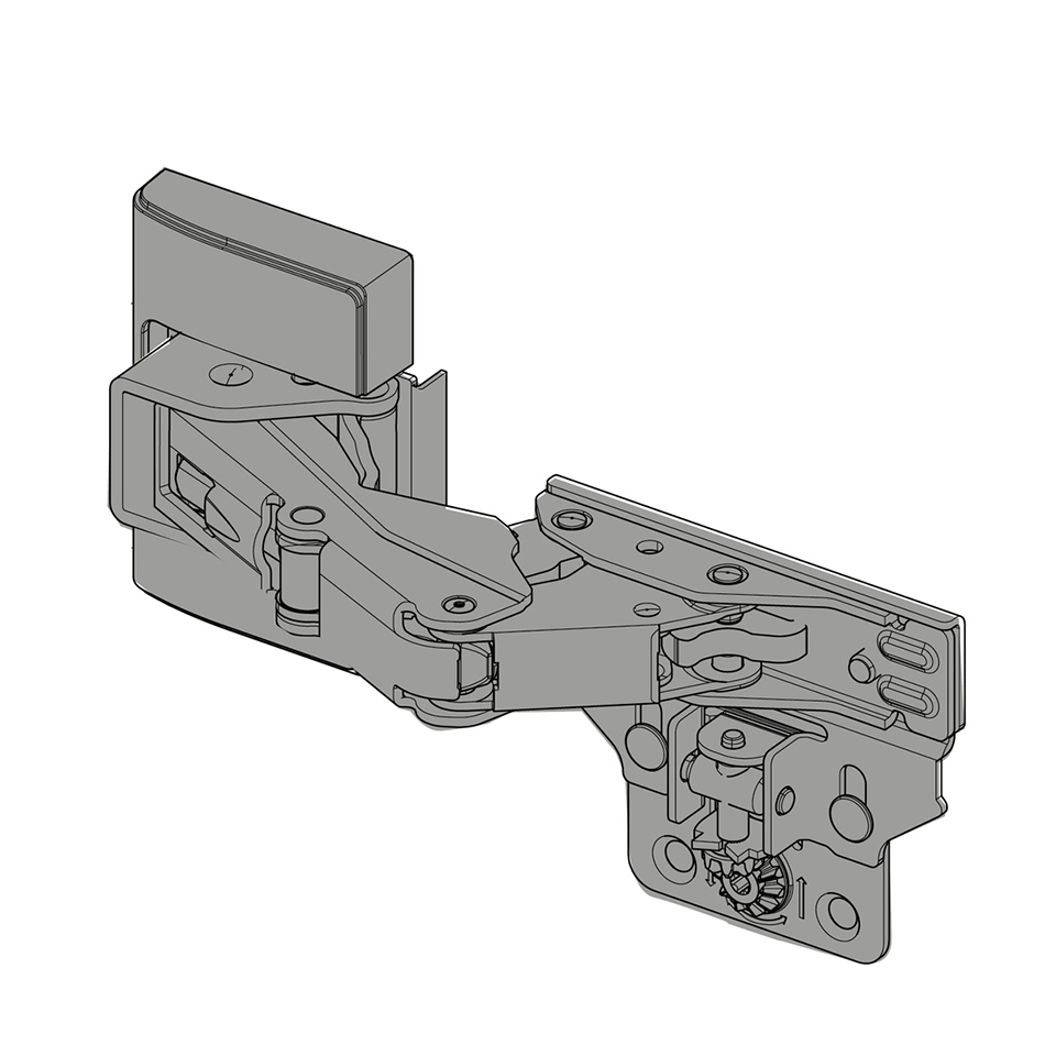 Úhel otevření 115°. Lze použít vlevo i vpravo. Pro korpusy s tloušťkou boků 16/18/19mm, vestavná hloubka 41,5mm. Montáž na vrut. Ocel pozinkovaná.
