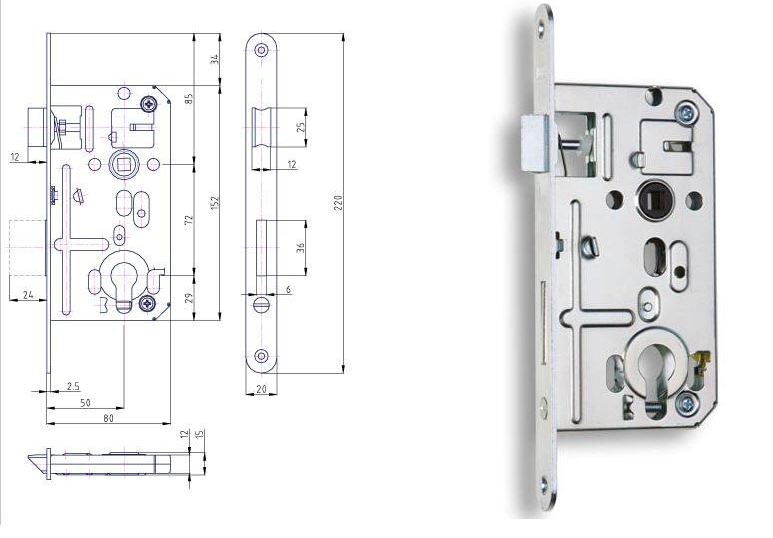 Stavebný zadlabávací zámok Hobes K133 pre FAB kľúč (PZ) o hĺbke 80mm, osové vzdialenosti 80 mm, osové vzdialenosti 80mm, rozteč 72mm. Povrchová úprava zinok biely. Dvojzápadový, s prevodom, s otvormi pre delené štíty, rozmer čela 220*20mm.