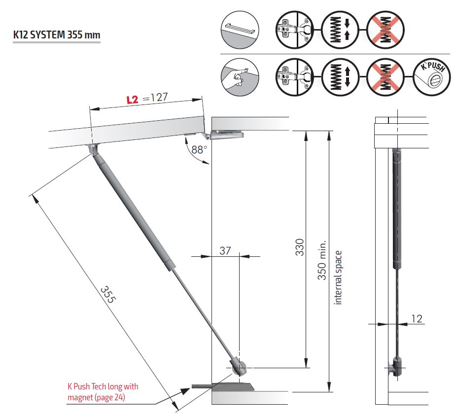 Klopňa K12 s automatickým plným otváraním. Pre dvierka s výškou 400-600mm. Nosnosť max. 8kg (2ks). Pre bezúchytkové otváranie doporučujeme použiť sady piestov K-push. Sady s adaptérom: s magnetom normálny - 227078. 350000, s magnetom extrasilný - 227080, 350001. Sady k zavŕtaniu: s magnetom normálny - 227079, s magnetom extrasilný - 227081.