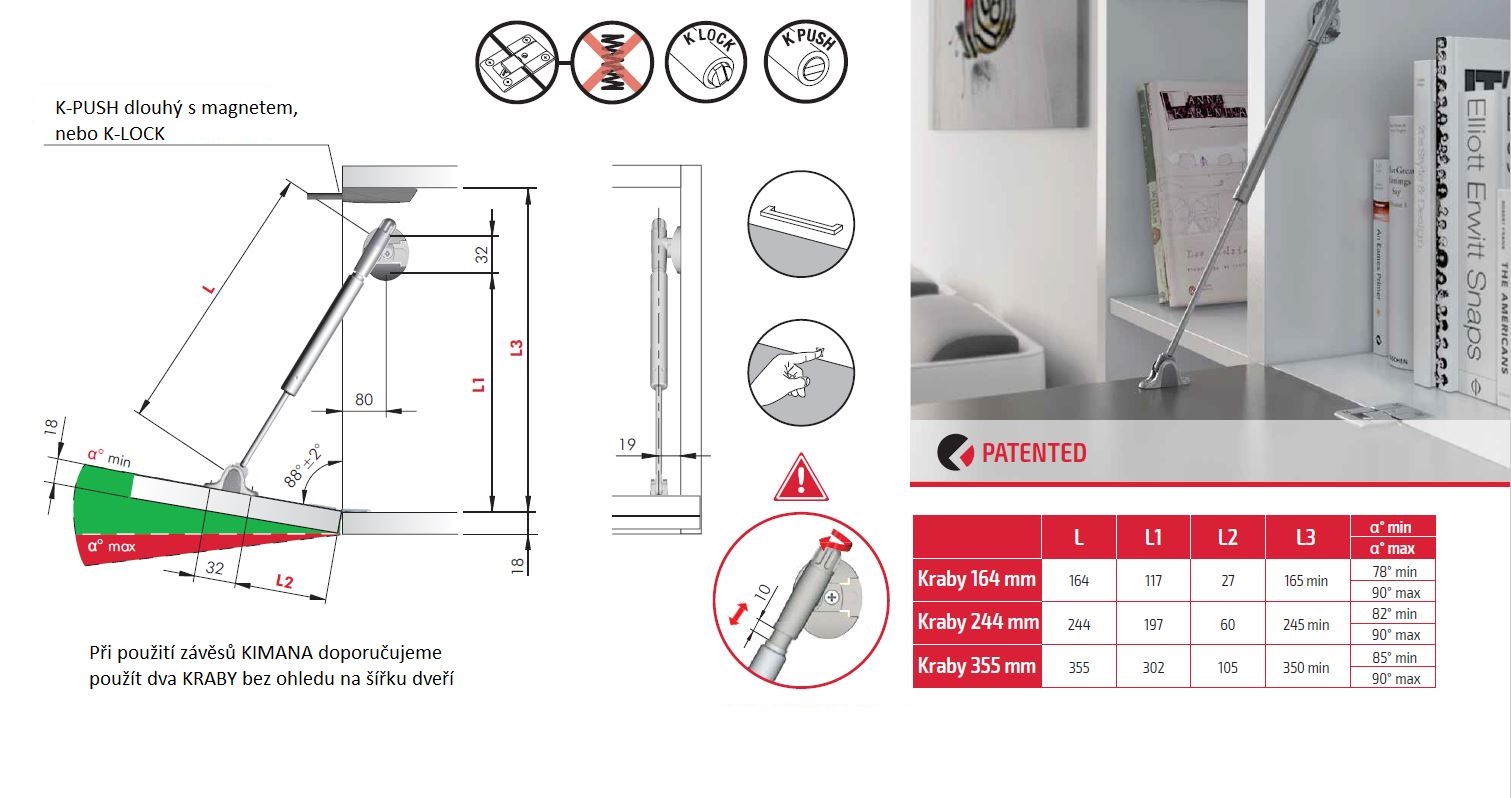 Plynokvapalinový piest pre spodné vyklápanie dvierok. Vhodné pre dvierka výšky 225-250mm, váhy nižšej jako 3,5kg a maximálna šírka 1200mm. Komplet vrátane uchytenia na korpus a plné čelo (široký rámček). V prípade použitia tenkého alu rámčeka je potrebné objednať adaptér 15597 + samorezný vrut 15598 2x a 15599 1x. Max. váha dvierok 4,9kg. Pre bezúchytkové otváranie doporučujeme použiť sady piestov K-push. Sady s adaptérom: s magnetom normálnym - 227078, 350000. S magnetom extrasilným - 227080, 350001. Sady k zavŕtaniu: s magnetom normálnym - 227079. S magnetom extrasilným - 227081.