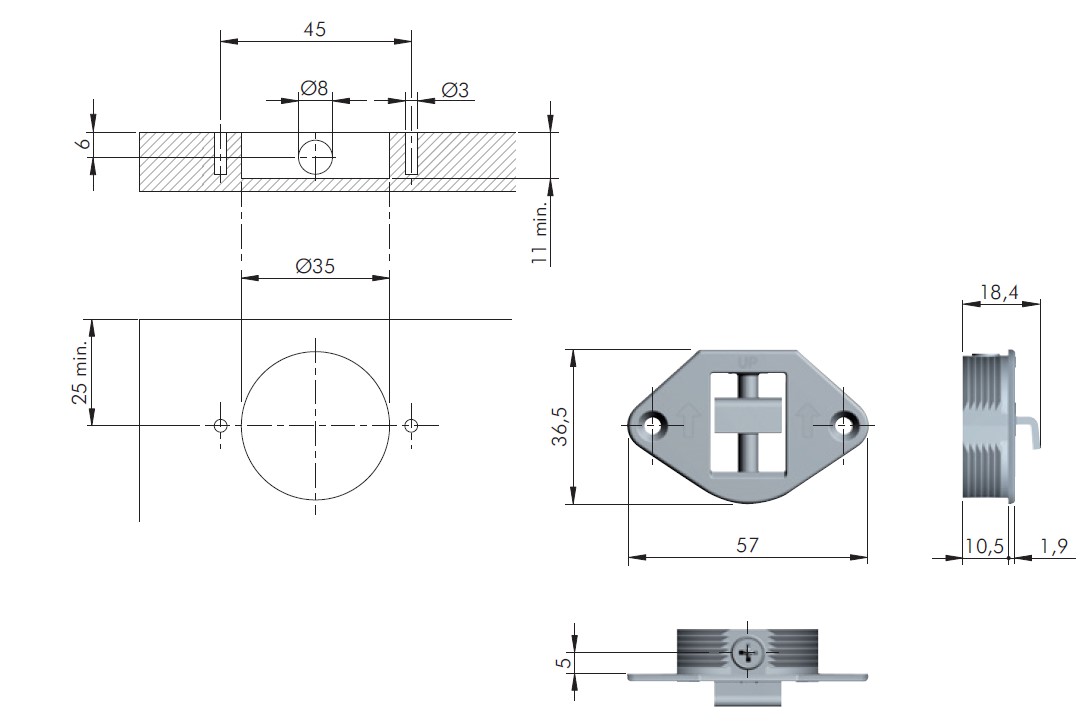 Kovanie pre zavesenie dosiek a panelov (zrkadlo, obklad) na stenu. Kovanie sa zavŕta do chrbta (vŕtanie pr.35mm). Ako protikus slúži závesná lišta na stenu, napr. 352537 alebo 389592 závesný plech na stenu s dorazmi Š=60mm