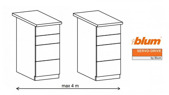 Sada ServoDrive pre 2 korpusy/8 zásuviek/max. výšky korpusu 1170 mm.Maximálna vzdialenosť korpusov medzi sebou 4 m Sada obsahuje všetky potrebné SERVO-DRIVE komponenty pre zostavenie funkčného elektricky bezúchytkovo otvaracieho nábytku (použitelné pre Antaro, Legrabox, Tandem a Movento). Výsuvy pre kombináciu se SERVO-DRIVE použite tlumené.