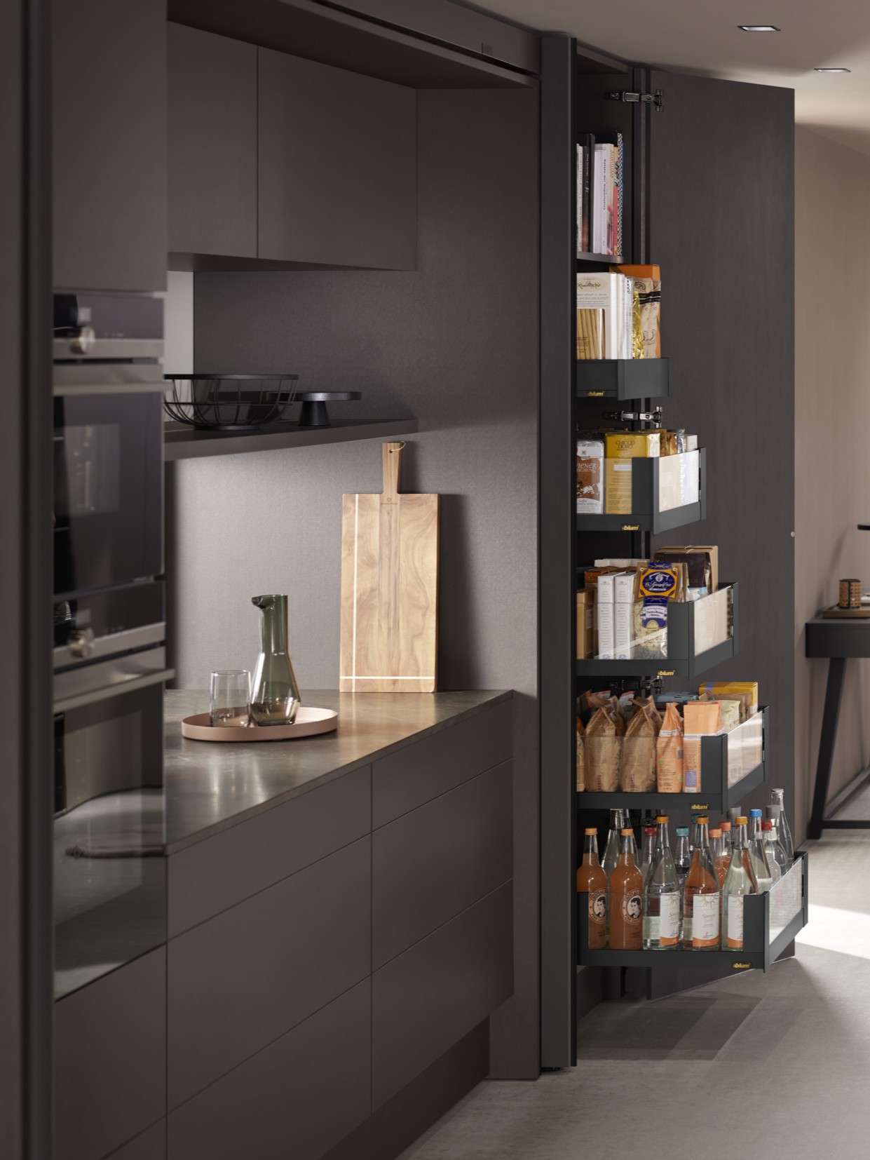 Komplet SpaceTower obsahuje všetko kovanie pre potravinovú skrinku s 1 nízkou a 4 vysokými zásuvkami, vrátane čelného kovania pre vnútornú výstuhu a potrebný počet čelných profilov a relingov v neskrátenom stave. Ďalej závesy s nulovým presahom, tlmením a podložkami. Pre šírku korpusu max. 600mm.