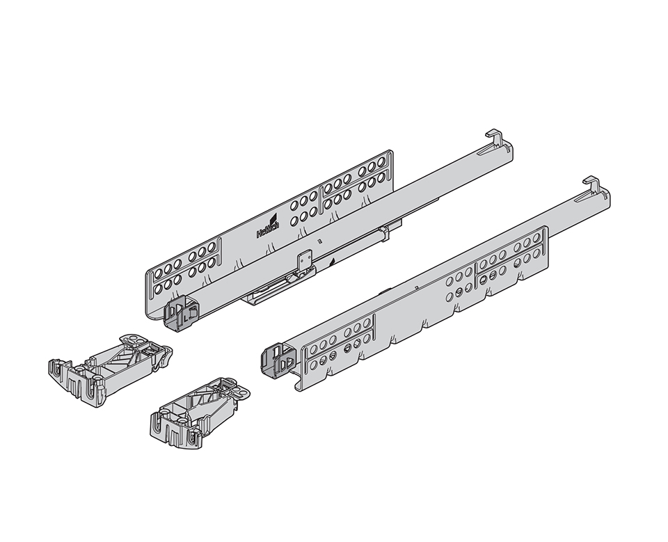 Kompletná sada kovania na výrobu drevenej zásuvky s plne výsuvnými mechanizmami Quadro YOU. Sada obsahuje pár výsuvov a pár čelných spojok. Čelné spojky umožňujú výškové nastavenie zásuvky bez použitia náradia.