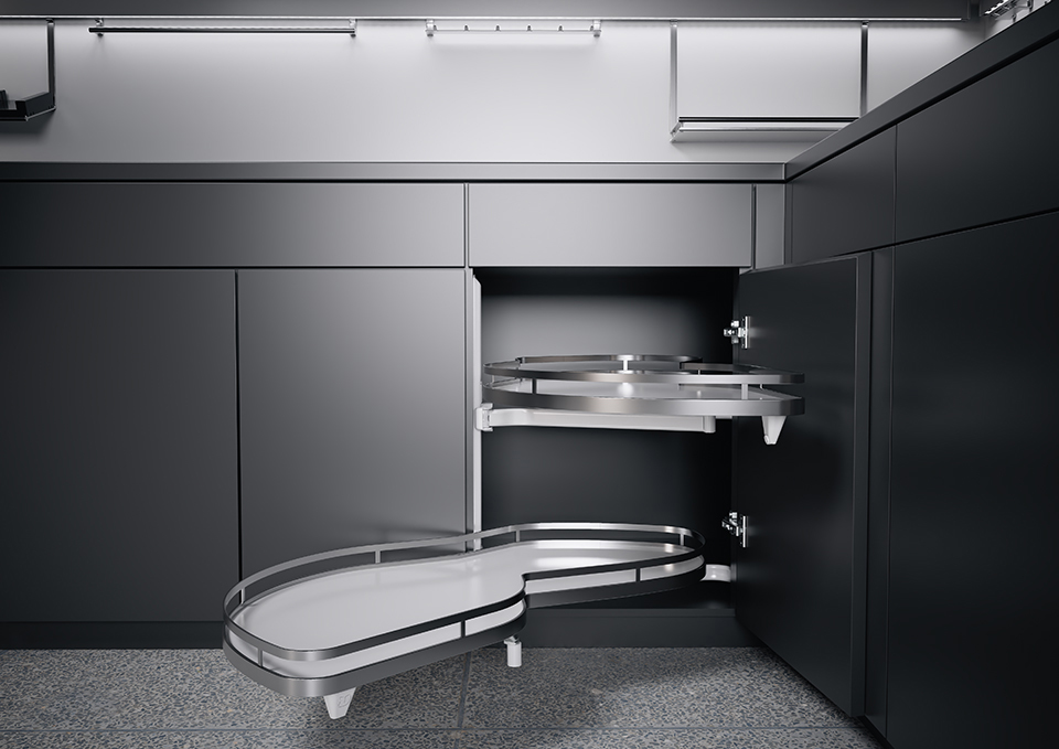 Vďaka špeciálne tvarovanej geometrii políc zvyšuje skutočnú úložnú plochu až o 70 %. Jednoznačná výhoda oproti porovnateľným výsuvným skrinkám. Ak je LeMans II vybavený tlmiacim mechanizmom, ktorý je k dispozícii ako voliteľné príslušenstvo, pohyb políc je takmer nehlučný. Tento optimálny komfort je možné kedykoľvek rýchlo a jednoducho dodatočne vybaviť.