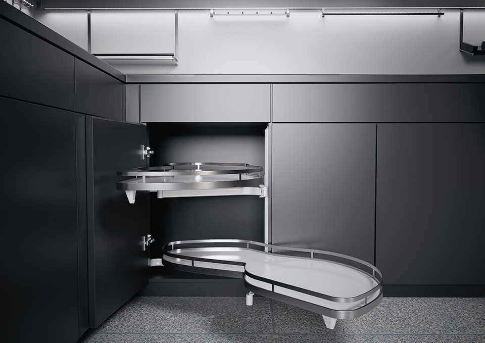 Vďaka špeciálne tvarovanej geometrii políc zvyšuje skutočnú úložnú plochu až o 70 %. Jednoznačná výhoda oproti porovnateľným výsuvným skrinkám. Ak je LeMans II vybavený tlmiacim mechanizmom, ktorý je k dispozícii ako voliteľné príslušenstvo, pohyb políc je takmer nehlučný. Tento optimálny komfort je možné kedykoľvek rýchlo a jednoducho dodatočne vybaviť.