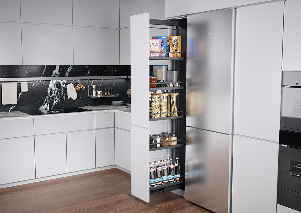 ... je výrobok, ktorý vďaka individuálne výklopným a výškovo nastaviteľným policiam zabezpečuje dostatok optimálne využitého priestoru na minimálnej zastavanej ploche. Celá výška a šírka skrinky sa dá plne využiť. Tým sa vytvára priestor, poriadok a prehľadnosť zároveň - a to nielen v kuchyni. Aj na horných policiach je vždy všetko na očiach - a to z oboch strán!