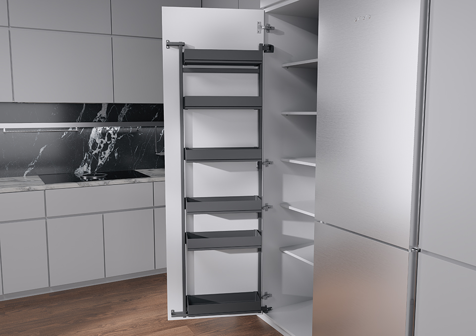 Kompletná sada kovania pre výrobu potravinovej skrine Tandem Side III - časť na dvere. S košami vo variante Arena Pure - antracit. Pre korpusovú šírku 600mm a výšku 1700mm.