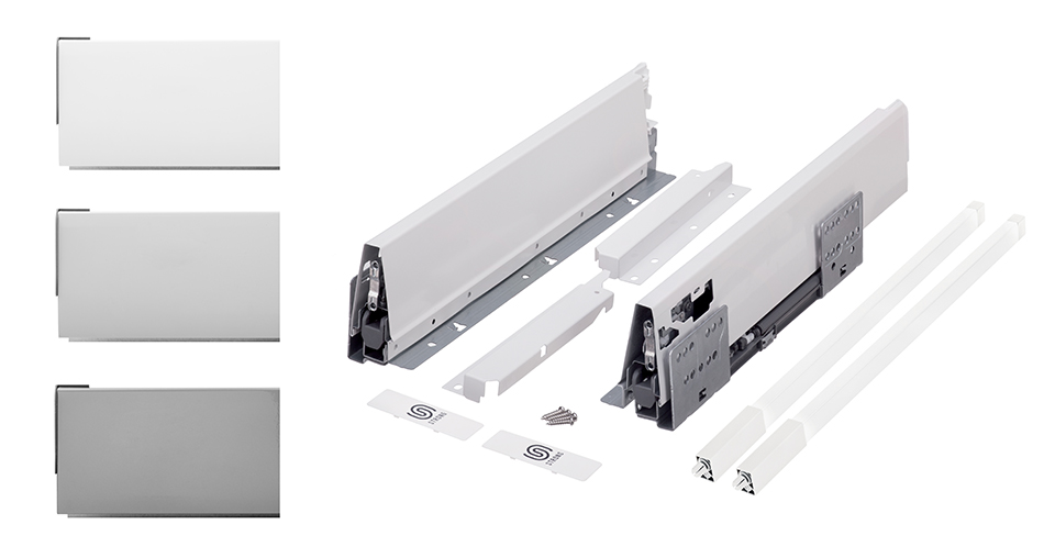 Výsuv s tlmením a dutou bočnicou vrátane 1 páru hranatých relingov. Dľžka 450mm, výška 204 (225mm). Nosnosť do 35kg. Farba biela. Všetko potrebné pre zostavenie čelnej zásuvky je v tomto sete. Pre vnútornú zásuvku je nutné doobjednať čelný panel.