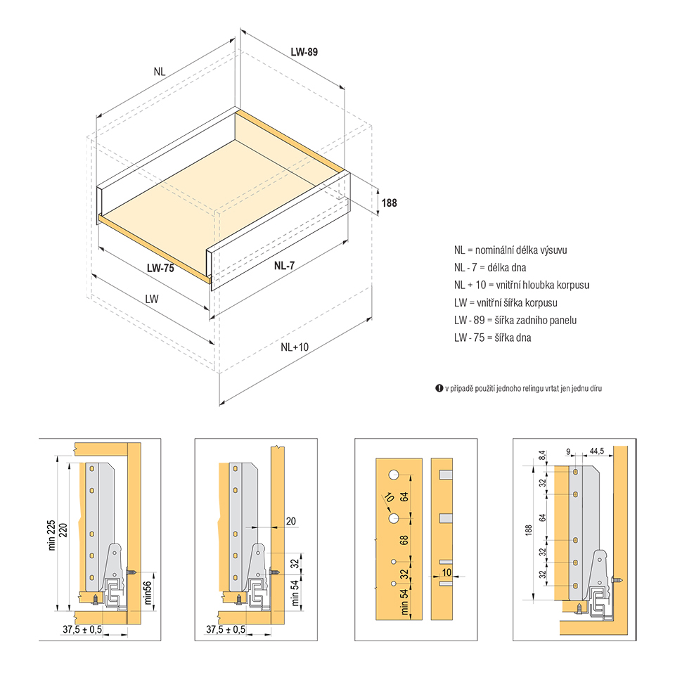 Výsuv s tlmením a dutou bočnicou vrátane 1 páru hranatých relingov. Dľžka 500mm, výška 204 (225mm). Nosnosť do 35kg. Farba biela. Všetko potrebné pre zostavenie čelnej zásuvky je v tomto sete. Pre vnútornú zásuvku je nutné doobjednať čelný panel.