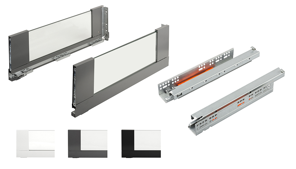 Systémová výška bočnice, menovitá dĺžka výsuvu, typ výsuvu a farba systému – viď názov sortimentu.