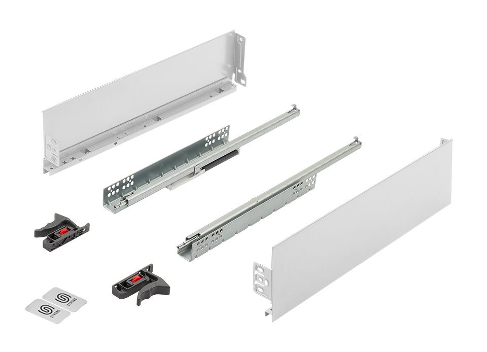 Kompletné kovanie na zostavenie ekonomickej boxovej zásuvky s extrémne tenkou kovovou bočnicou (single-wall) hrúbky 1 mm a skrytými tlmenými výsuvmi. Okrem čela je potrebné doplniť ešte prírezy dna a zadnej steny (rovnaká šírka), možno použiť materiál hrúbky 16 mm aj 18 mm.