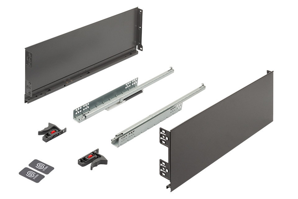 Kompletné kovanie na zostavenie ekonomickej boxovej zásuvky s extrémne tenkou kovovou bočnicou (single-wall) hrúbky 1 mm a skrytými tlmenými výsuvmi. Okrem čela je potrebné doplniť ešte prírezy dna a zadnej steny (rovnaká šírka), možno použiť materiál hrúbky 16 mm aj 18 mm.
