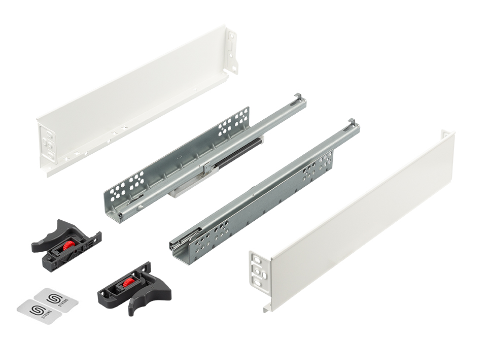 Kompletné kovanie na zostavenie ekonomickej boxovej zásuvky s extrémne tenkou kovovou bočnicou (single-wall) hrúbky 1 mm a skrytými tlmenými výsuvmi. Okrem čela je potrebné doplniť ešte prírezy dna a zadnej steny (rovnaká šírka), možno použiť materiál hrúbky 16 mm aj 18 mm.