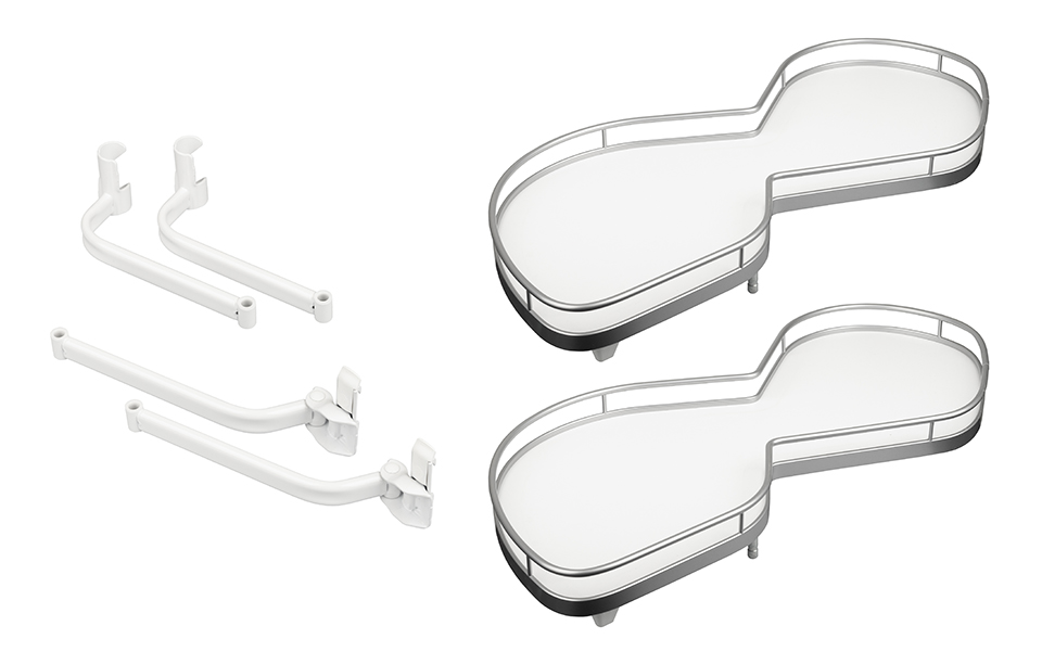 Sada dvoch políc Arena CLASSIC pre riešenie spodnej rohovej skrinky (tzv. slepého rohu) LeMans II. Dno s Anti-slip s protišmykovou povrchovou úpravou. K LeMans II je možné pridať externý tlmič ktorý policu dotiahne, pri uzavretí utlmí a zabráni rázu. Pre korpus 800mm. Montáž tlmiča na vonkajšie rameno. Vnútorné rozmery korpusu: Šírka: 764, Hĺbka 500, výška: 600-750mm prípadne 720-900mm. Minimálny rozmer dverí 361-368mm. Montážna tyč + uchytenie na bok korpusu - 160132, externý tlmič pre ľavú variantu - 160133. nosnosť police 25kg.