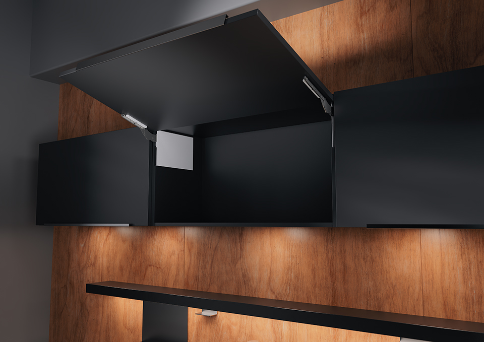 Výklopný mechanismus FREEslim Flap - PTO. Mechanismus lze namontovat přišroubováním z vnitřní strany korpusu, nebo zafrézovat z vnější strany do bočnice. Maximální výška korpusu může být 650mm a maximální šířka 1800mm. Zároveň je potřeba dodržet výkonnostní faktor.