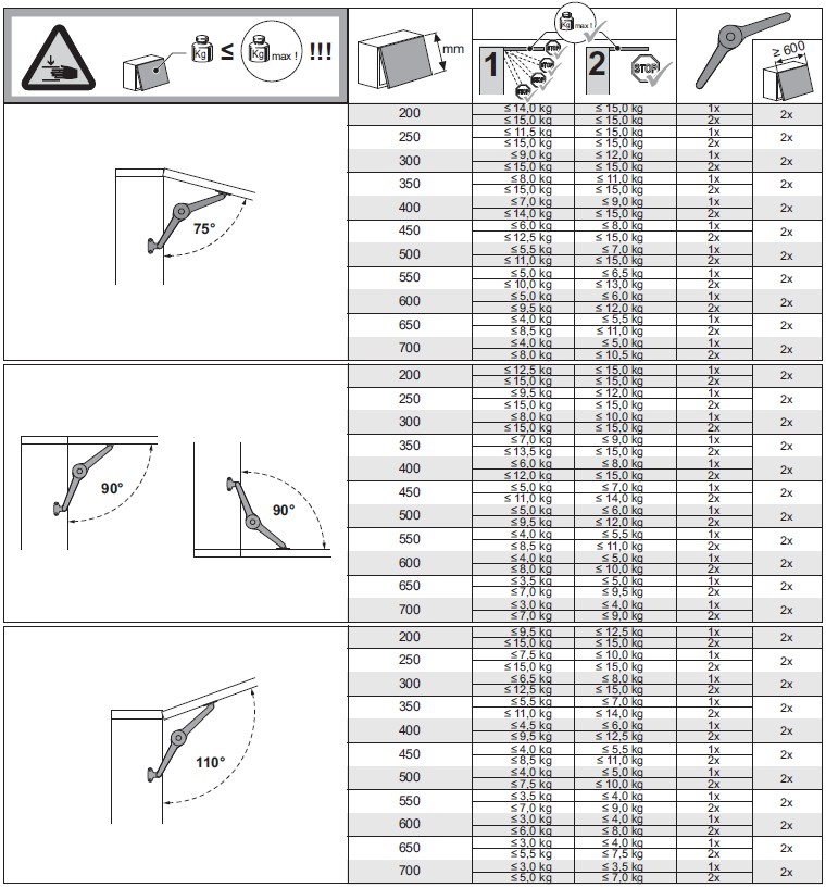 Polohovateľná klopna DUO FORTE pre väčšie a ťažšie dvierka. Uhol otvorenia 75, 90 a 110°. Možno pre horné i spodné vyklápanie dvierok (pretočením ramien). Nutné doobjednať uchytenie dverí a korpusu ( 135019+135021 alebo 135024 pre alu ramček )