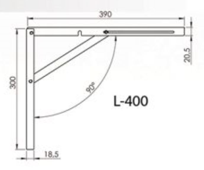 Sklopná konzola s dĺžkou ramena 40 cm v satinovej farbe (komaxit). Nosnosť 100 kg/pár. Ideálne pre sklopné police, malé stoly a iné. Pre úsporu miesta je možné stolovú dosku, či odkládaciu dosku sklopiť. So vzperou pre vyššiu nosnosť. Splňuje bezpečnostné a vytrvalostné atesty podľa normy PN-EN 12521:2009 i PN-EN 15372:2010. Vzdialenosť police od steny pri úplnom sklopení je 30mm.