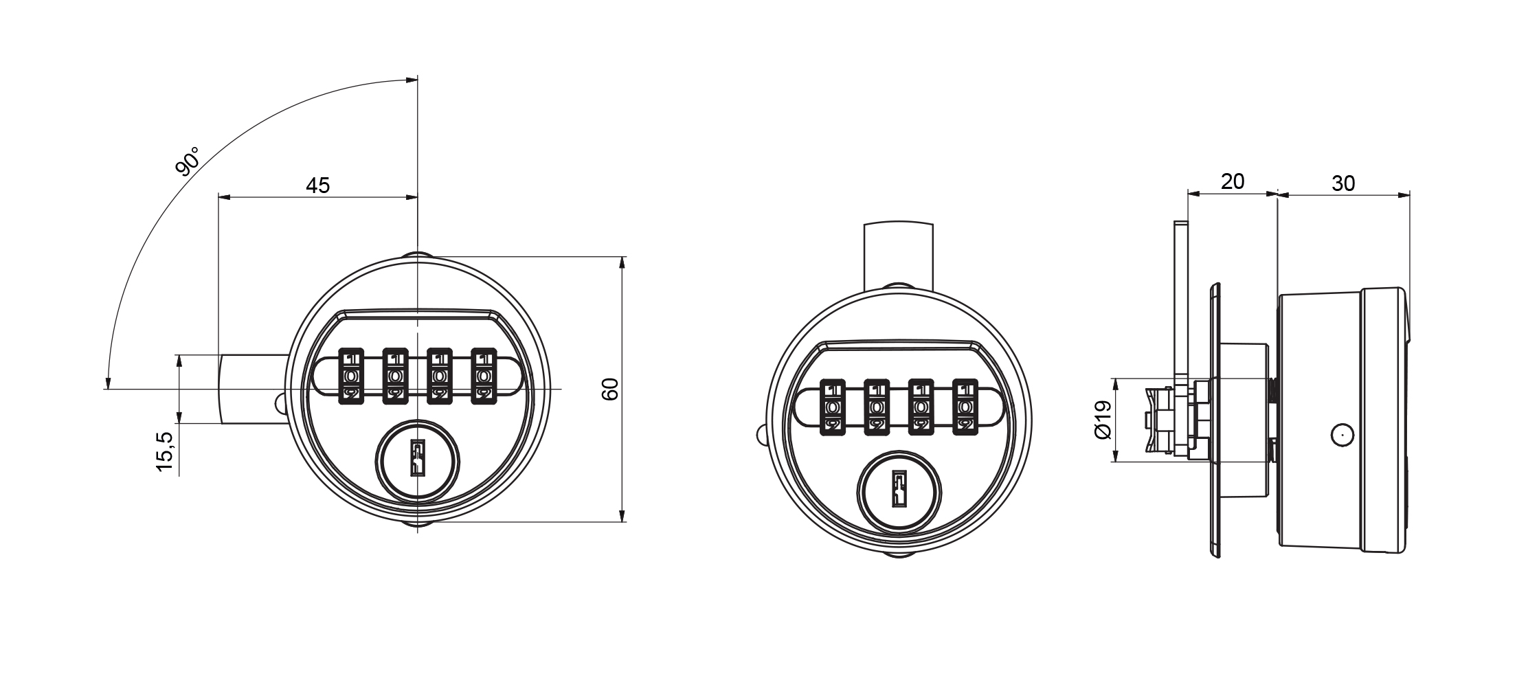 Okrúhly číselný zámok typ 61, čierna farba pravoľavý, bez závory, pre materiál hr. 0,8-12mm, vŕtanie 16x19mm, pre pohotovostný kľúč typ Z0001
