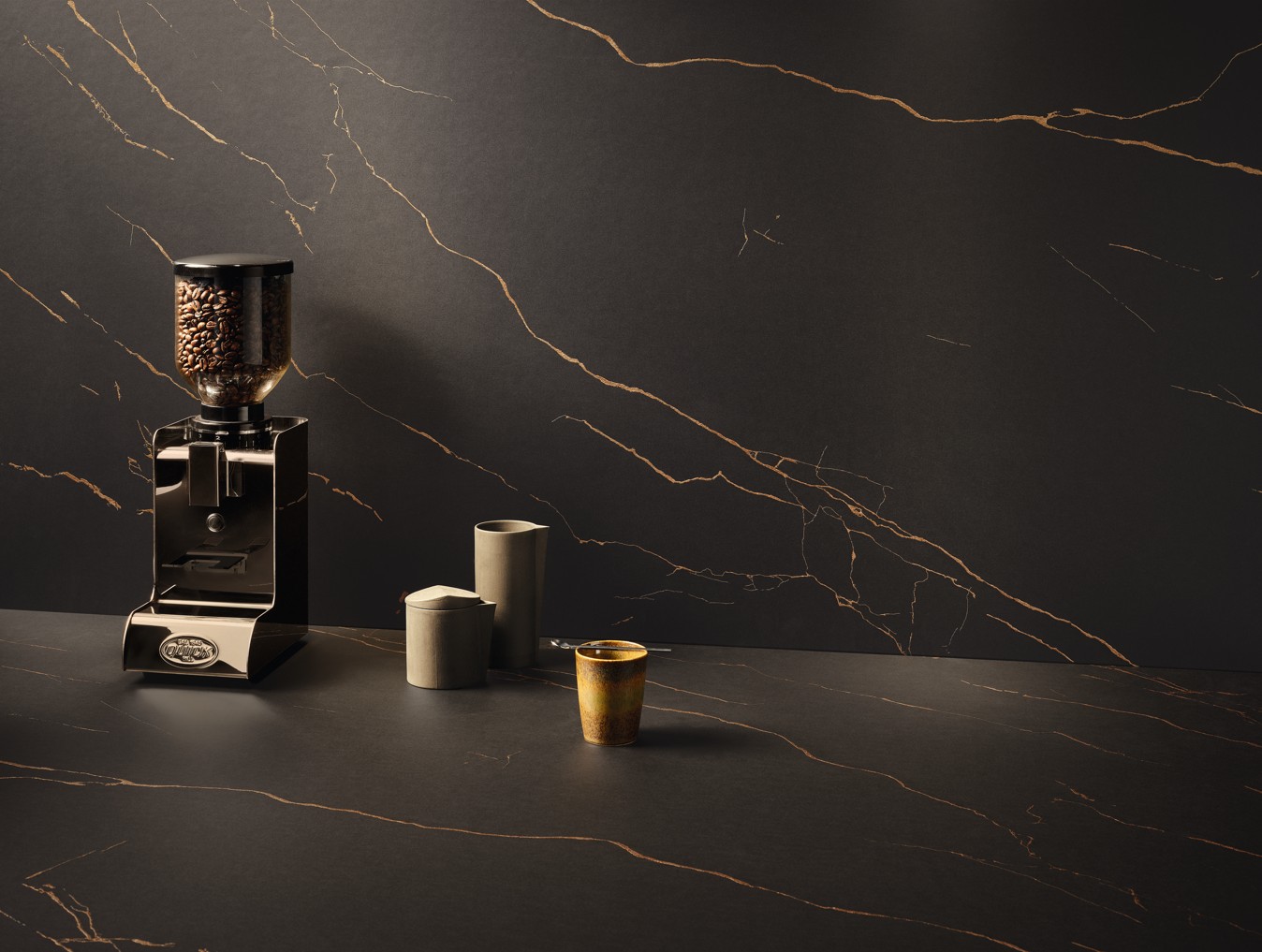 Pracovná doska PerfectSense Ambiance s rovnou hranou (ABS) pre kuchynské linky a plochy pre prípravu jedál. Povrch PerfectSense Ambiance jedinečným spôsobom kombinuje zamatovo matný vzhľad rady PerfectSense s výraznými prvkami zrkadlového lesku a autenticky napodobňuje luxusné mramorové a žulové povrchy.