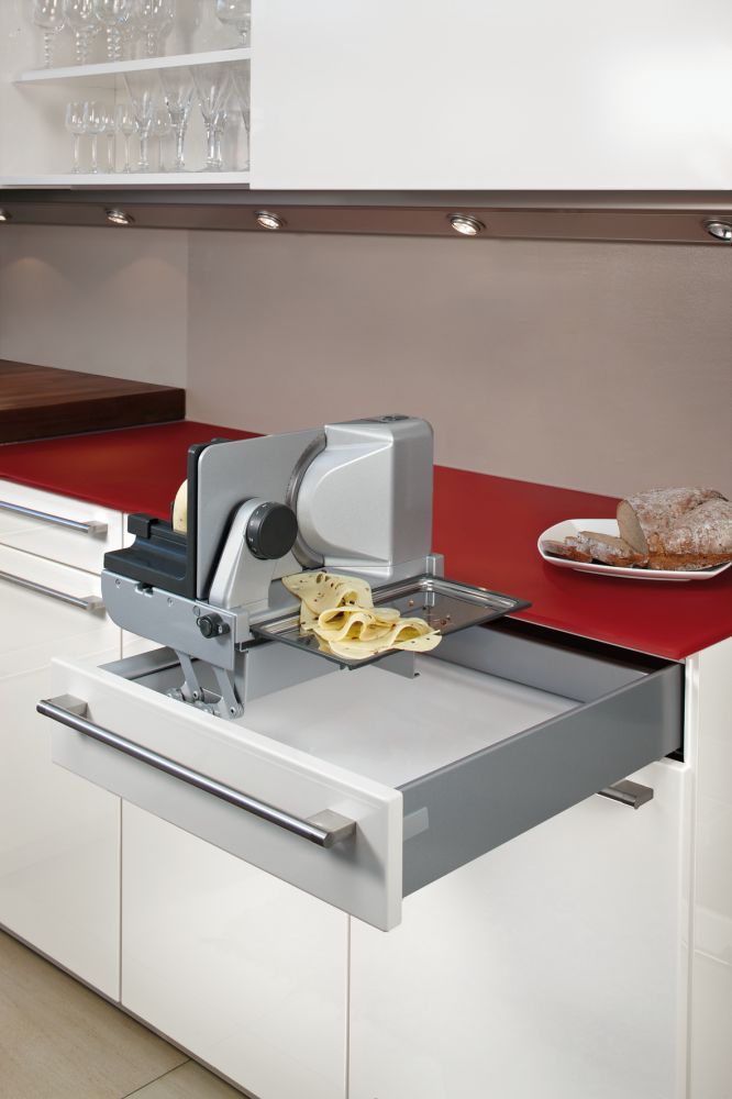 možnosť nastavenia plynulého rezu až do 14 mm, odnímateľná nerezová miska s pevným uložením na krájači,