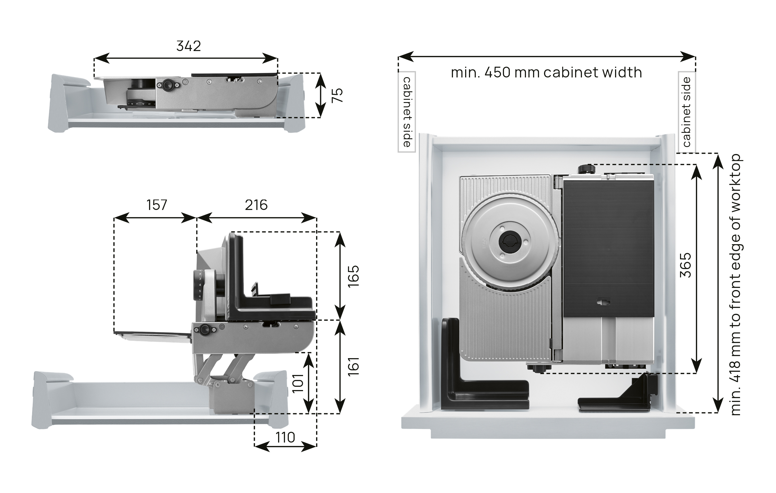 Univerzálny vstavaný krájač. Výška: 75 mm, šírka: 342 mm, hĺbka: 365 mm (priklopené).