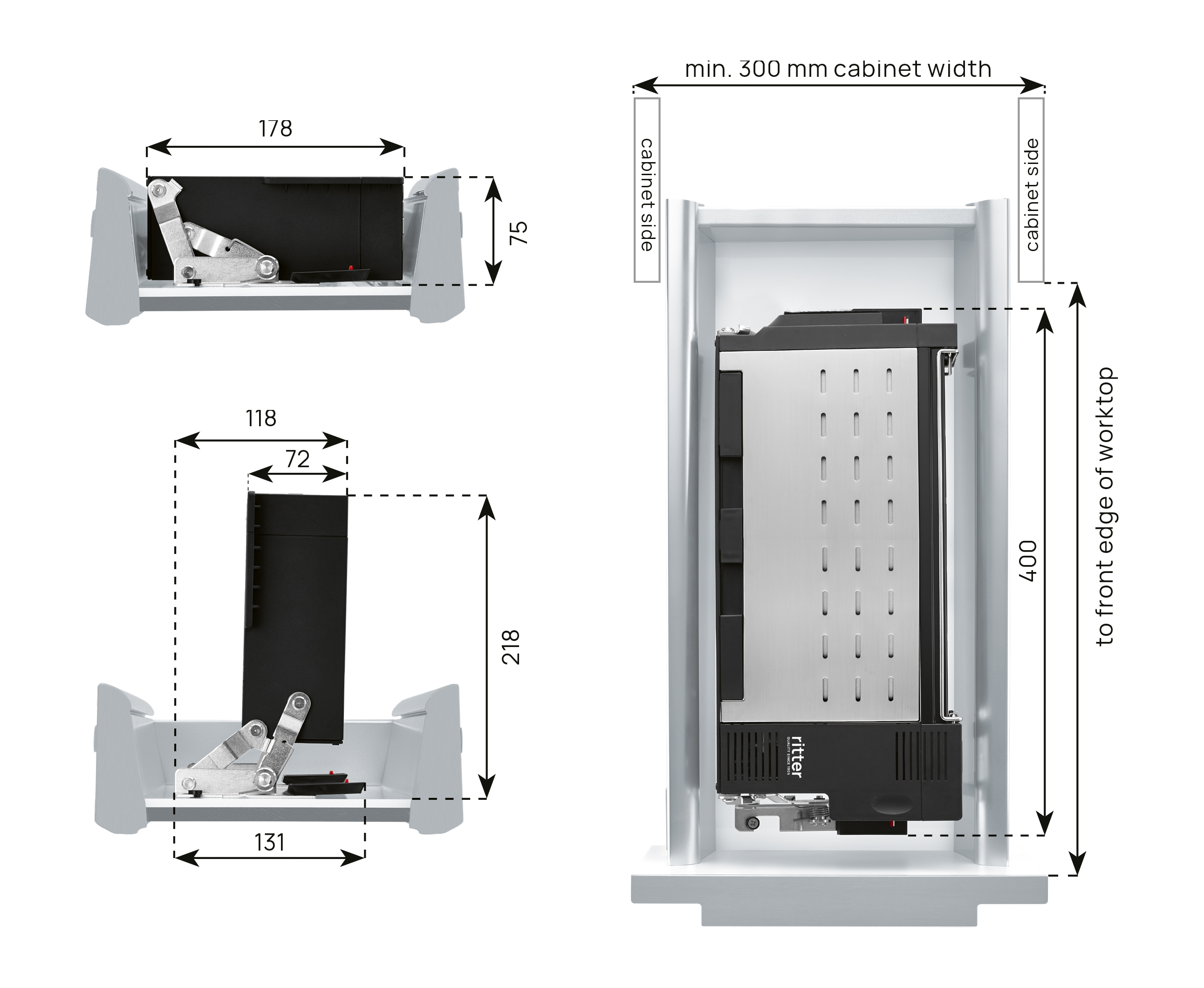 Vstavaný toustovač pre montáž do kuchynských zásuviek o min. šírke korpusu 30 cm. Rozmer V: 75 mm Š: 178 mm H: 400 mm
