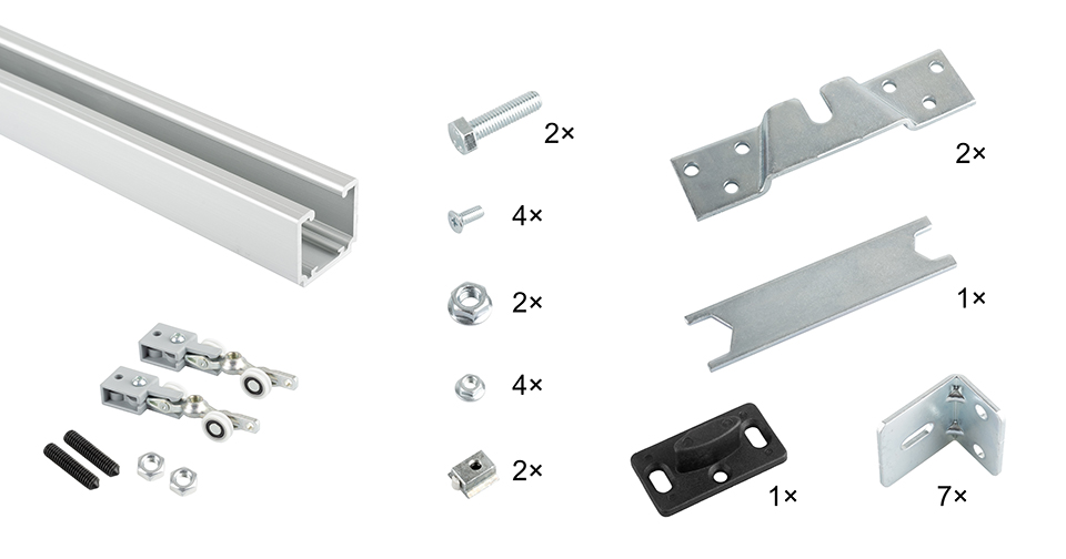 Sada kování pro jedno křídlo s brzdou. Včetně horního vedení o délce 3000mm a příchytů na zeď. Nosnost: 40 kg. Baleno v tubusu. Skladem i verze s tlumením - 545377 Posuvné interiérové kování sada pro 1 křídlo včetně vedení 3m, 40kg, 2x tlumič. .