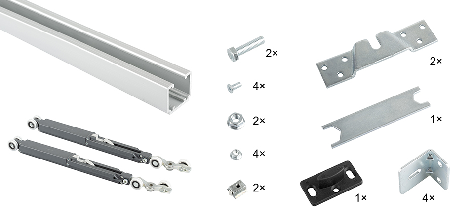 Sada kovania pre jedno krídlo s tlmením. Vrátane horného vedenia o dĺžke 1500mm a príchytov na stenu. Nosnosť: 40 kg. Balené v tube. .