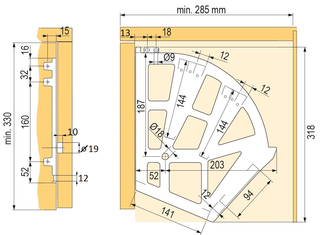 Botníkový výklop pro Tri police na topánky. rozmer polic na topánky: hrúbka 12mm, výška 144/144/94mm, šírka podľa svetlej šírky korpusu (LW - 8mm).