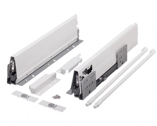 Výsuv s tlmením a dutou bočnicou vrátane 1 páru relingu. Dĺžka 450mm, výška 140(165mm). Nosnosť do 35kg. Farba biela. Všetko potrebné pre zostavenie čelnej zásuvky v tejto sade. Pre vnútornú zásuvku je nutné doobjednať čelný panel.