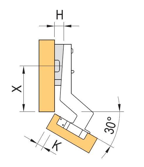 Záves KLIP uhlový 30° na skrutku s integrovaným tlmením. Uhol otvorenia 110°. Rozteč skrutiek 45mm a 9,5mm od stredu misky. Miska 35mm. Montáž a demontáž dvierok na korpus bez náradia. Doporučené podložky: H0 skrutka 92590T, H2 Euro 92591T; H2 skrutka 92592T, H2 Euro 92593T.