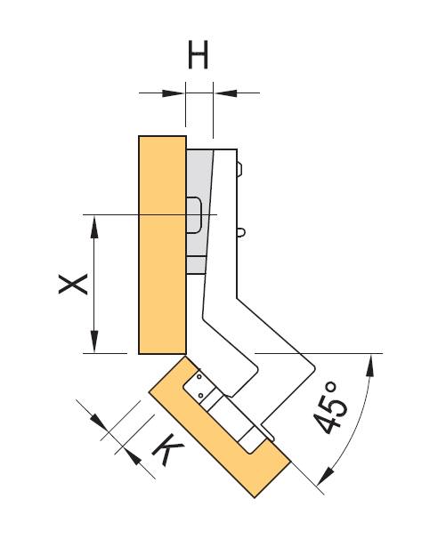 Záves KLIP uhlový 45° na skrutku s integrovaným tlmením. Uhol otvorenia 110°. Rozteč skrutiek 45mm a 9,5mm od stredu misky. Miska 35mm. Montáž a demontáž dvierok na korpus bez náradia. Doporučené podložky: H0 skrutka 92590T, H2 Euro 92591T; H2 skrutka 92592T, H2 Euro 92593T.